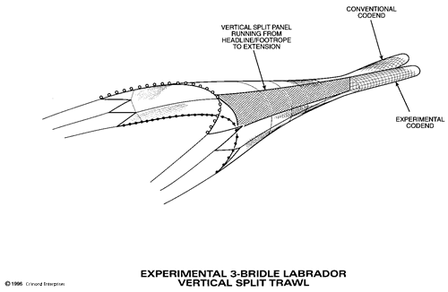 Unlike similar vertical split panels, which begin several meters behind the footrope, the panel design commenced at the Headrope and Footrope then ran back to the last belly where the separation of the extensions and codends took place. (see drawings) The main objective was to totally eliminate migration of shrimps from one side of the trawl to the other.